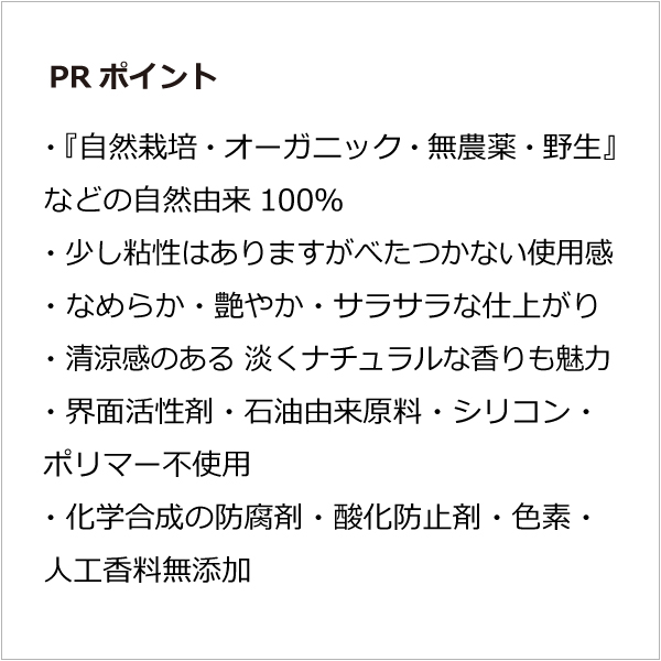 【ヘアウォッシュ】 水(精製水)、ヤシカリ石けん(フィリピン・エコサート)*、ワサビノキ葉水(モリンガ芳香蒸留水:沖縄県・無農薬・無化学肥料栽培))、ダマスクバラ花水(長野県・自然栽培)、ビワ葉エキス(長野県・自然栽培)、スギナ葉エキス(長野県・野生)、スイカズラ葉エキス(長野県・野生)、ワサビノキ種子油(モリンガオイル:インド・無農薬)、アルガニアスピノサ核油(アルガンオイル:モロッコ・ノンロースト・エコサート)*、ツバキ種子油(岡山県・野生)、ローズマリー油(長野県・自然栽培)、セイヨウハッカ油(長野県・自然栽培)、ティーツリー油(長野県・自然栽培) 【ヘアコンディショナー】 水(精製水)、クエン酸(鹿児島県・サツマイモ由来)、ワサビノキ葉水(モリンガ芳香蒸留水:沖縄県・無農薬・無化学肥料栽培)、ローズマリーエキス(和歌山県・自然栽培)、ブドウ発酵エキス(山梨県・有機JAS)*、キサンタンガム(アメリカ・エコサート・とうもろこし由来)*、ビワ葉エキス(長野県・自然栽培)、スギナ葉エキス(長野県・野生)、スイカズラ葉エキス(長野県・野生)、アルガニアスピノサ核油(アルガンオイル:モロッコ・ノンロースト・エコサート)*、ツバキ種子油(岡山県・野生)、ローズマリー油(長野県・自然栽培)、セイヨウハッカ油(長野県・自然栽培)、ティーツリー油(長野県・自然栽培) ーツリー油 |