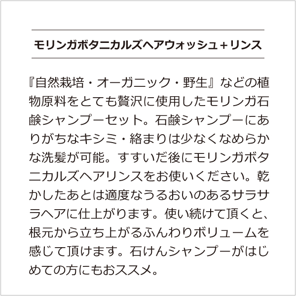 | 内容量 | モリンガヘアウォッシュ:300ml モリンガヘアコンディショナー:300ml |