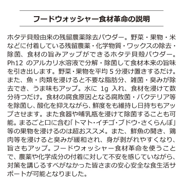 | 製品名: | フードウォッシャー 食材革命90g ホタテ貝殻由来の残留農薬除去パウダー |