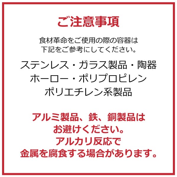 | ご注意事項 | 食材革命には「アルミ、鉄、銅」で作られた容器はご使用にならないでください。アルカリ反応で腐食する場合がございます。 |