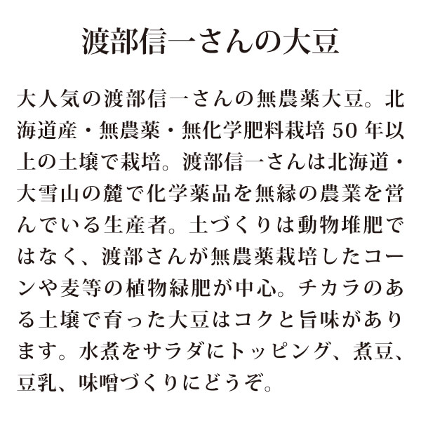 | 製品名: | 【農薬不使用】渡部信一さんの大豆約5kg(約1kg×5個) 北海道産 無農薬 無化学肥料栽培 |