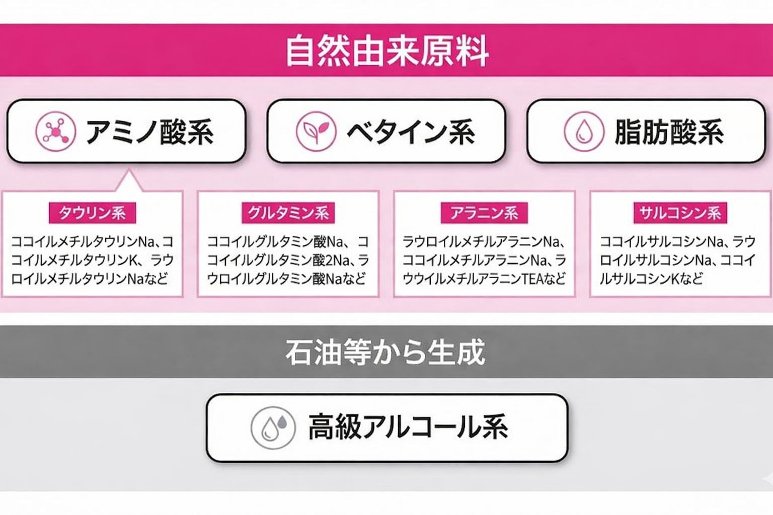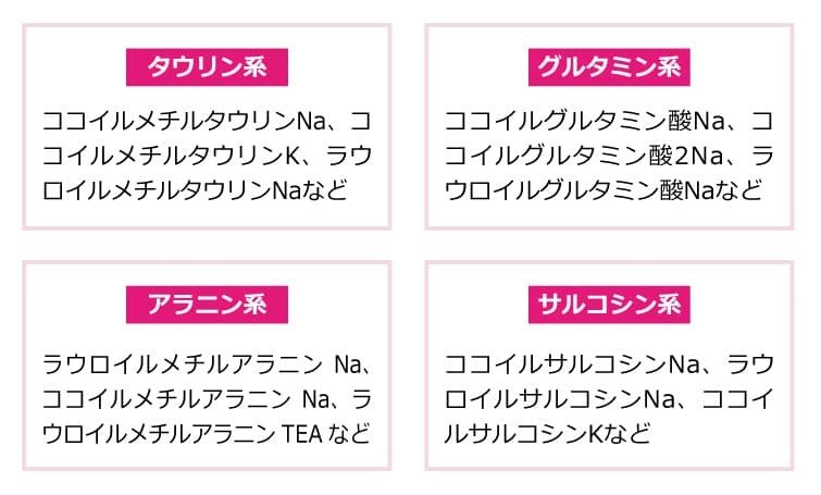 アミノ酸系と一口に言っても、いくつかの系統があります。代表的なものをまとめます。