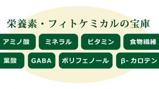 含有栄養成分は、アミノ酸・ミネラル・ビタミン・食物繊維・葉酸・GABA等の栄養成分、ポリフェノール・β‐カロテン・クロロフィル(葉緑素)」等のフィトケミカル(自己防衛するための天然の化学物質)。これらを驚くような量で含有しています。