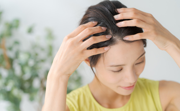 ◎毎日の頭皮マッサージ(2-3分程度)で血流を促す。生え際-頭頂部に向かって指の腹で円を描くように。