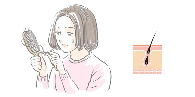 ◎女性も更年期や出産後にエストロゲン(女性ホルモン)が減少すると、髪が細くなり抜けやすくなる。