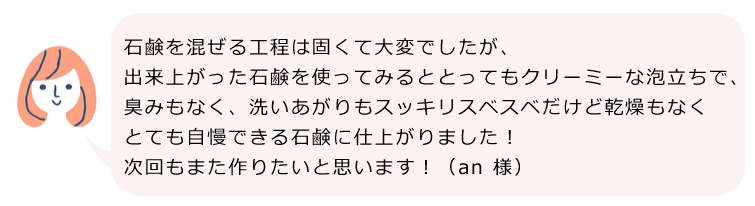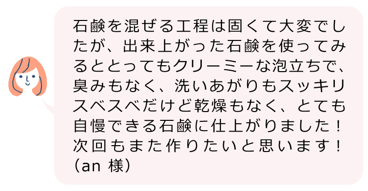 説明通り泡立ちも良く溶けにくいです。完全無添加の石鹸素地はとてもありがたいです。思ってた以上に良い石けんができて嬉しいです。(Y 様)