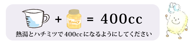 【2】 ハチミツ(またはエキス)を加えます。熱湯にハチミツを加え(湯との合計で400cc)、キレイに溶かしてから石鹸素地に入れてください。たとえばハチミツ10gの場合は10ml(cc)と換算し、熱湯とハチミツで400ccになるようにしてください。ハチミツは固形ですのでかならず溶かし入れてください(沸騰前後どちらでも結構です) 。