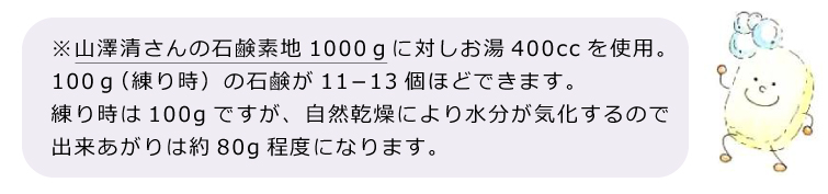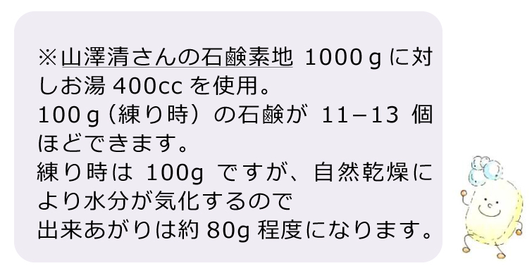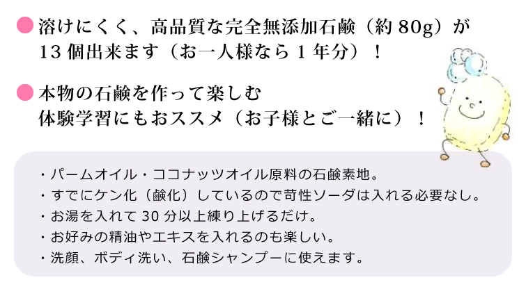 【補足事項】油脂を使って最初から石鹸を作る場合、ケン化に必要な苛性ソーダ(水酸化Na)は「劇物」と指定されている薬品です。扱いを間違えると危険ですが、この「石鹸素地」なら苛性ソーダを使用しませんので、安心して石鹸作りをお楽しみ頂けます。