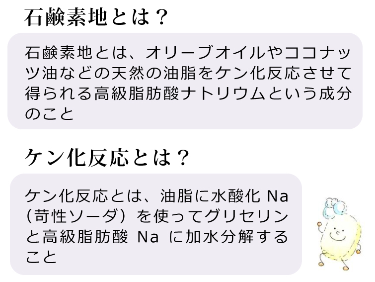 石鹸素地とは、オリーブオイルやココナッツ油などの天然の油脂をケン化反応させて得られる高級脂肪酸ナトリウムという成分のことです。(ちなみに当店大人気のアレッポの石鹸の全成分表記は「石鹸素地100%」)