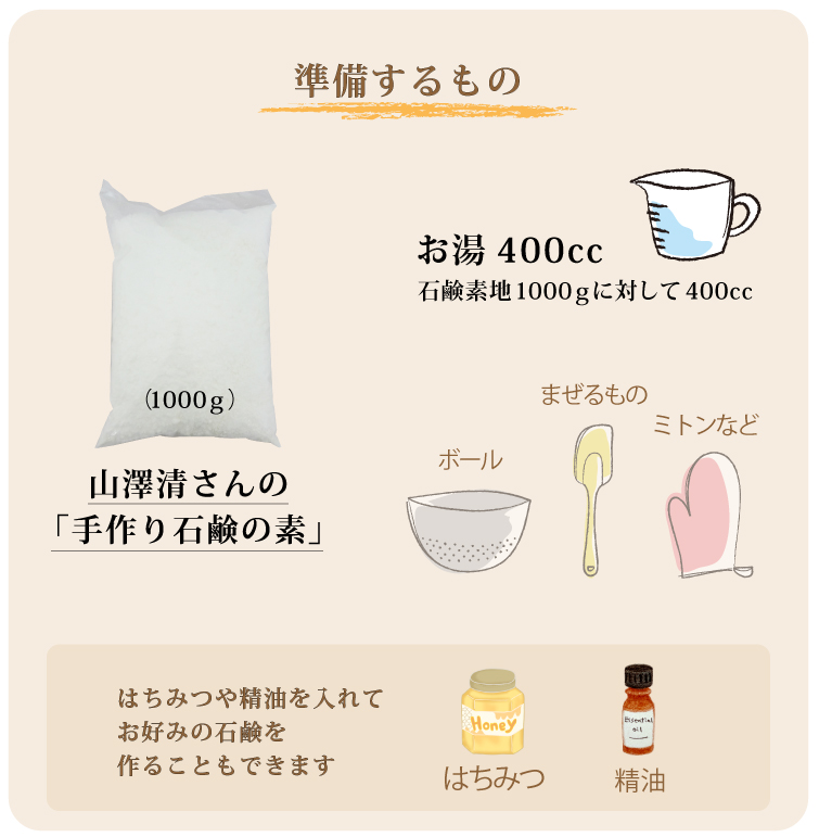 手作り石鹸の素は、パームオイル・ココナッツオイルが原料の石鹸素地(ケン化した粉末タイプの高級脂肪酸ナトリウム)です。山澤清さんもこの石鹸素地をベースに色々な固形石鹸を作っておられます。すでにケン化した石鹸素地なので苛性ソーダを加える必要もなく安心。どなたにでも石鹸作りが楽しめます。