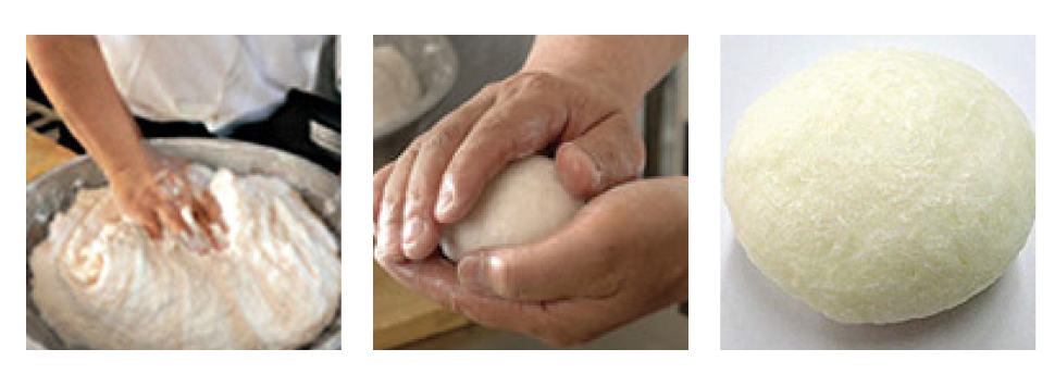 【4】 30分〜40分程練って、生地の中に気孔やムラがなくなったら練り上げ終了。あとは、丸める、型に入れるなどしてお好みの大きさ、形に作り上げます。